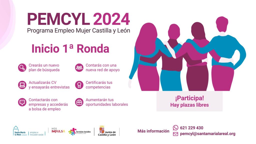 El Programa Empleo Mujer Castilla y León (PEMCYL) 2024, impulsado por la Junta de Castilla y León, tiene como objetivo mejorar la empleabilidad y la inserción sociolaboral de mujeres en situación de especial vulnerabilidad de esta comunidad autónoma. Esta novena edición comenzó en febrero su primera ronda con la participación de 76 mujeres desempleadas de entre 21 y 63 años, residentes en áreas urbanas y rurales. Como novedad en esta nueva edición, el programa ofrece formación en sectores emergentes y contenidos sobre bienestar emocional, con el objetivo de lograr un 65% de inserción laboral. También se incluye un módulo de herramientas digitales, al final del cual las participantes recibirán un certificado de habilidades digitales, y podrán integrarse al “Plan Acompaña” para recibir asesoramiento continuo.