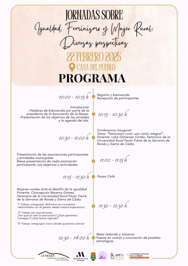 La Asociación de Mujeres La Mojea ha anunciado la celebración de unas jornadas sobre igualdad, feminismo y la mujer rural. El evento, titulado «Igualdad, feminismo y Mujer Rural: Diversas perspectivas», tendrá lugar el próximo sábado 22 de febrero a partir de las 10:00 horas en la Casa del Pueblo de Cuevas del Becerro.