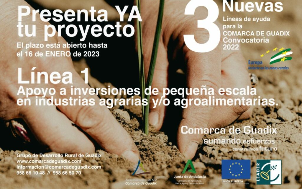 Aquellas empresas de la comarca de Guadix del sector agroalimentario que tengan en mente realizar un proyecto centrado en la transformación y comercialización de productos agrarios, pueden presentar sus proyectos para acceder a una de las ayudas que contempla el Grupo de Desarrollo Rural (GDR) de la Comarca de Guadix en el marco de la nueva convocatoria del 2022, concretamente en la Línea 1, de apoyo a inversiones de pequeña escala en las industrias de este sector.