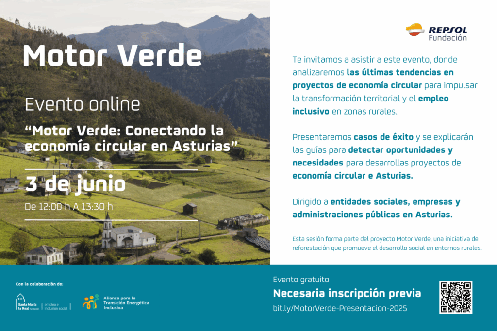 Motor Verde es una iniciativa de Fundación Repsol y Grupo Sylvestris, centrada en la reforestación a gran escala con impacto social, refuerza su compromiso con el desarrollo sostenible y la inclusión social en Asturias. En 2025, su programa de impulso social centrará sus esfuerzos en aprovechar las oportunidades que ofrece la economía circular, promoviendo nuevas formas de colaboración entre quienes actúan en el territorio, formación técnica y generación de empleo verde.El punto de partida será el evento online “Motor Verde: Conectando la economía circular en Asturias”, que se celebrará el 3 de junio, de 12:00 a 13:30. La sesión sin coste para los asistentes está dirigida a profesionales de empresas, administraciones públicas y entidades sociales, abordará las principales tendencias del sector, compartirá casos de éxito locales y fomentará el diálogo para detectar necesidades y oportunidades concretas en la región. Las Inscripciones ya están abiertas.