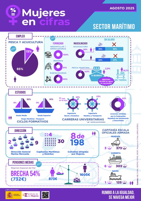 Los datos demuestran claramente las persistentes desigualdades de género dentro del sector marítimo. Pueden consultarse los datos completos de esta infografía en la página web del Instituto de las Mujeres para obtener una comprensión más profunda del problema y reconocer que «Rumbo a la igualdad se navega mejor».