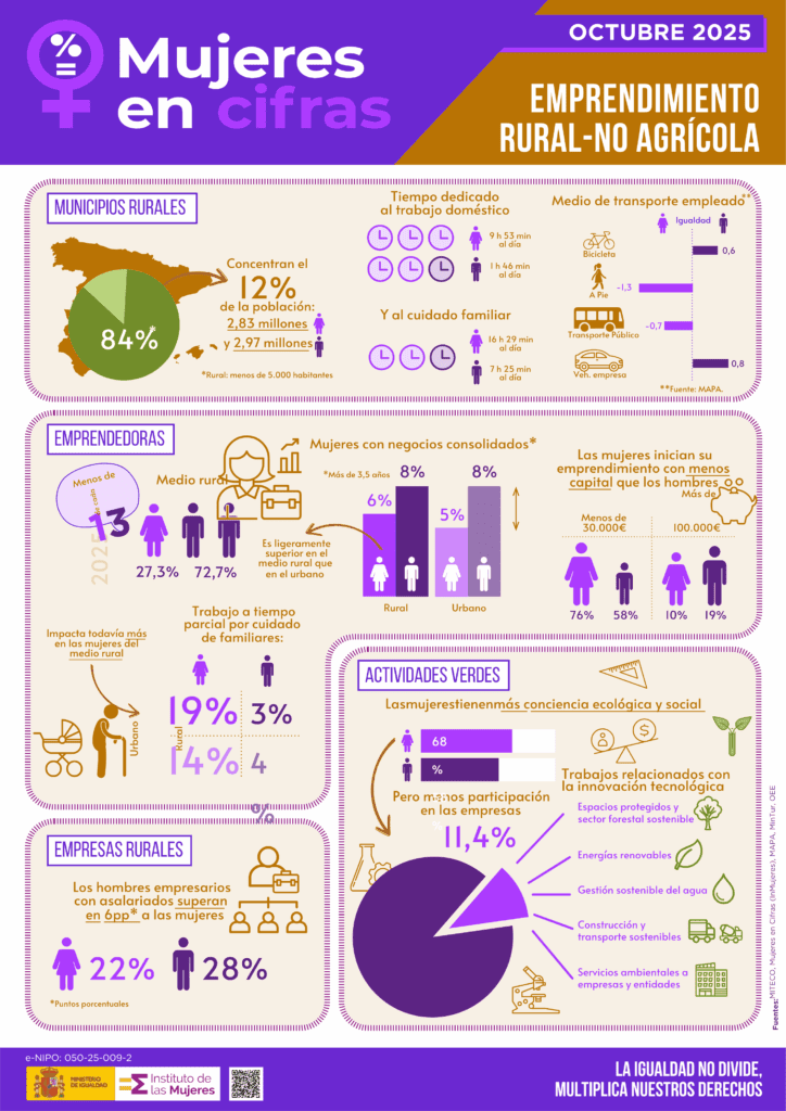 poniendo el foco en el emprendimiento rural no agrícola que evidencia las disparidades de género que persisten en las zonas rurales de España. A pesar de que el 84% de los municipios son rurales, solo concentran el 12% de la población, con una ligera diferencia entre hombres (2.97 millones) y mujeres (2.8 millones).
