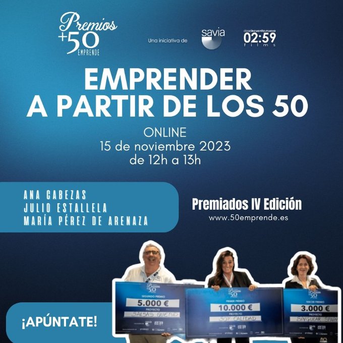 Generación SAVIA, de la Fundación Endesa y Fundación máshumano, y la productora Dos Cincuenta y Nueve Films convocan la V Edición de los Premios +50 Emprende. El objetivo es reconocer e impulsar a las personas mayores de 50 años que han promovido o quieran promover proyectos de emprendimiento.